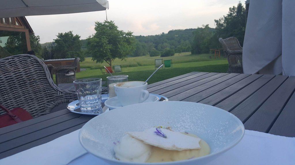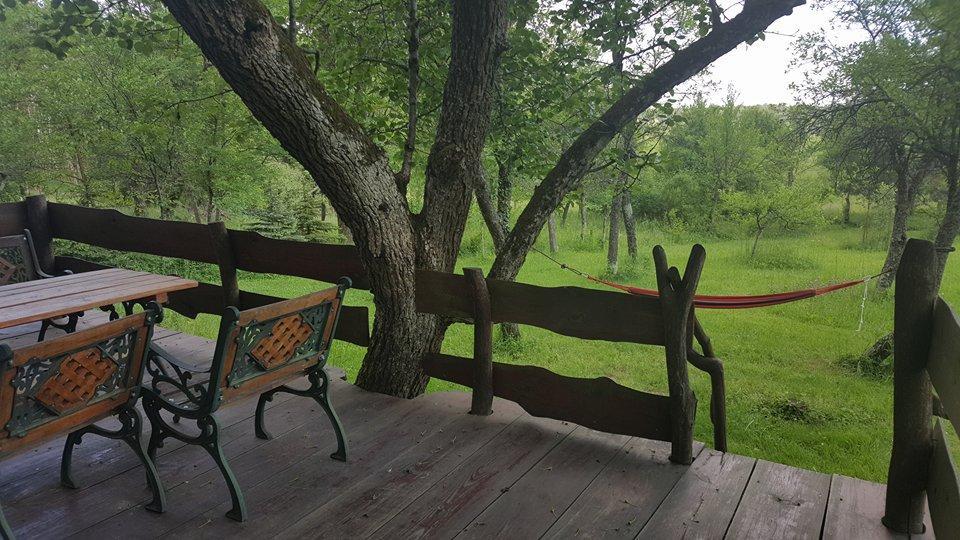 Itt ülök egy különleges hangulatú teraszon. Előttem buja zöld mező, virágokkal, fenyvesekkel, fákkal, hintaágyakkal. Lassan száll lefelé az esti pára.